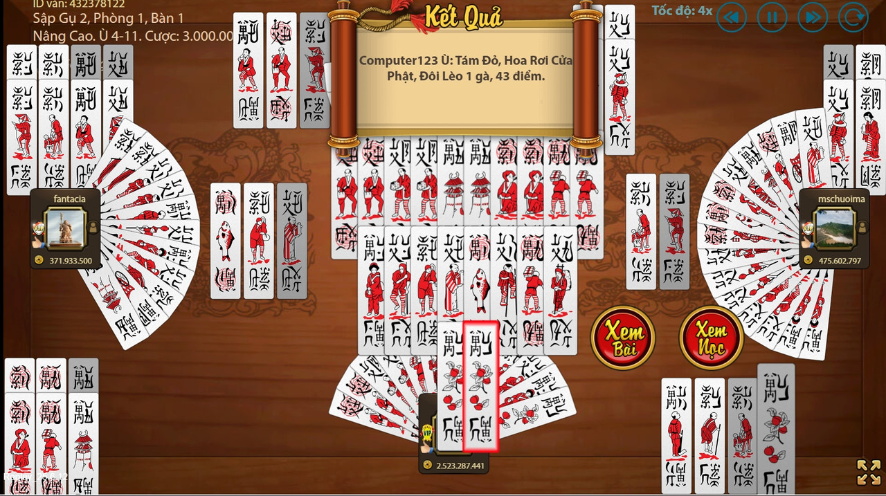 2. Ván Bài Hay - Computer123 Ù: Tám Đỏ, Hoa Rơi Cửa Phật, Đôi Lèo 1 gà, 43 điểm.