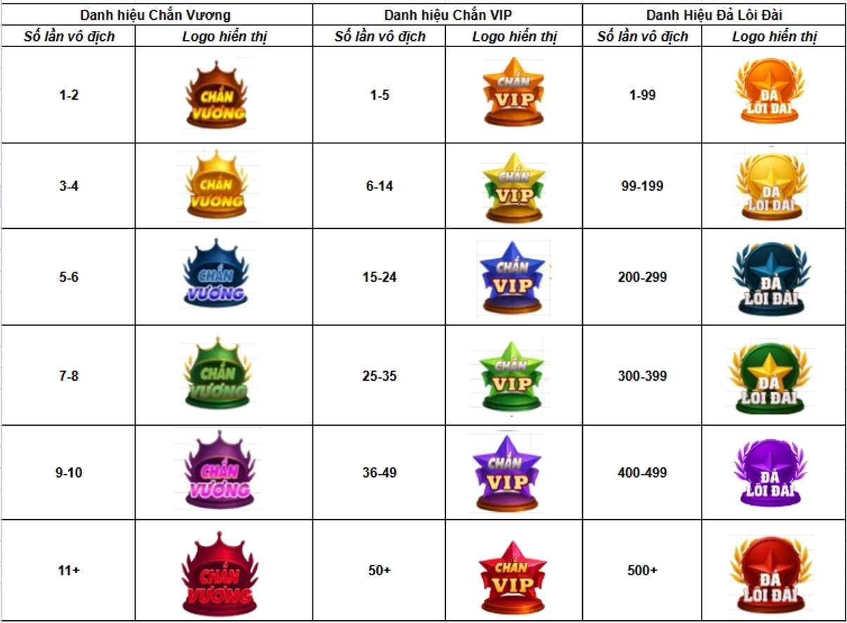 Từ hôm nay, khi người chơi đạt đến các mốc vô địch nhất định, logo danh hiệu sẽ nâng cấp sang phiên bản cao cấp hơn, đẹp mắt hơn và thể hiện rõ đẳng cấp tương ứng.