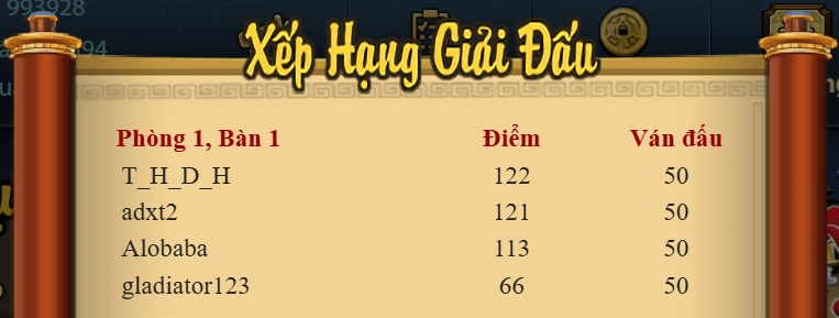 Lúc này thành viên gladiator123 xếp thứ 4 kém người đầu bàn 47 điểm. Trong tay còn NSHV và lên bài có cửa gò cước to là Ù Trì Bạch Thủ Chi 8 đỏ (Bài đã ăn chắn 9 sách, còn cầm Chi Chi, 9 Vạn, 8 Vạn) Nhà dưới đã đánh đỏ và có dấu hiệu tẩy đỏ chờ bạch định.