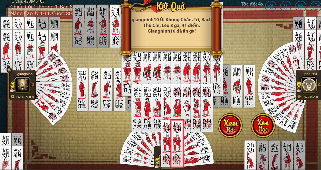 2. Ván Bài Hay: giangninh10 Ù: Không Chắn, Trì, Bạch Thủ Chi, Lèo 3 gà, 41 điểm.