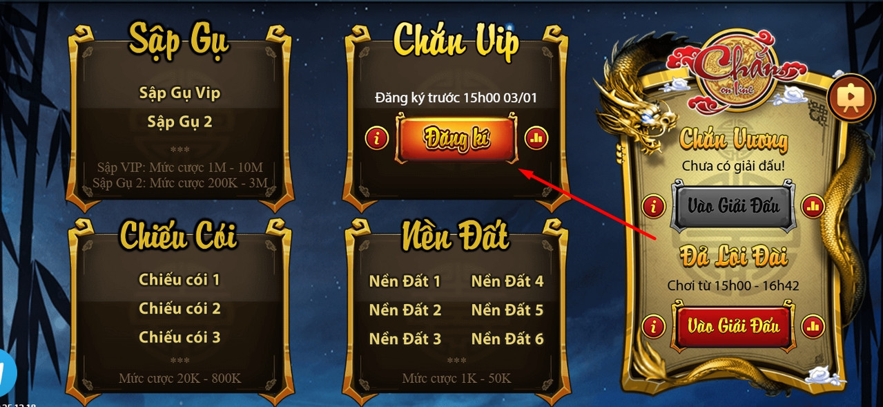 Đúng 20h15 ngày thi đấu, các thành viên có tên trong danh sách thi đấu sẽ vào game Chắn chọn phần Vào Giải Đấu ở mục Chắn Vương như trong hình dưới đây và chọn Phòng 1 Bàn 1 để vào thi đấu.