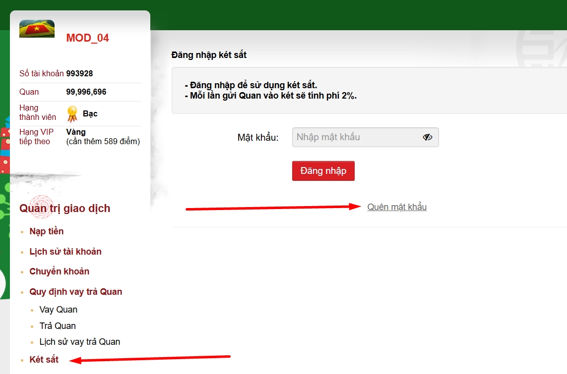 Tại giao diện két sắt, nhấn vào nút "Quên mật khẩu két sắt"