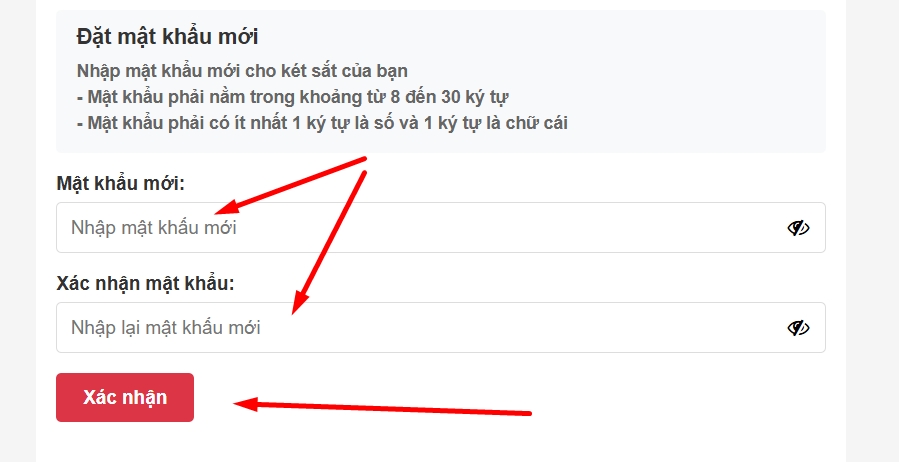 - Khi nhập OTP chính xác bạn sẽ có thể thiết lập mật khẩu mới thay thế cho mật khẩu cũ bị quên