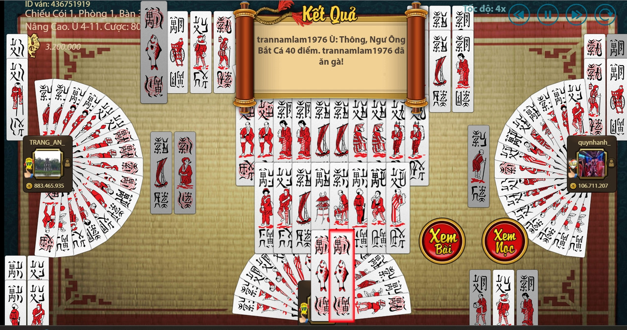 - Ván Bài Hay: Hphuong09 Ù: Thông, Cá Lội Sân Đình, Cá Nhảy Đầu Thuyền, Tôm 52 điểm.